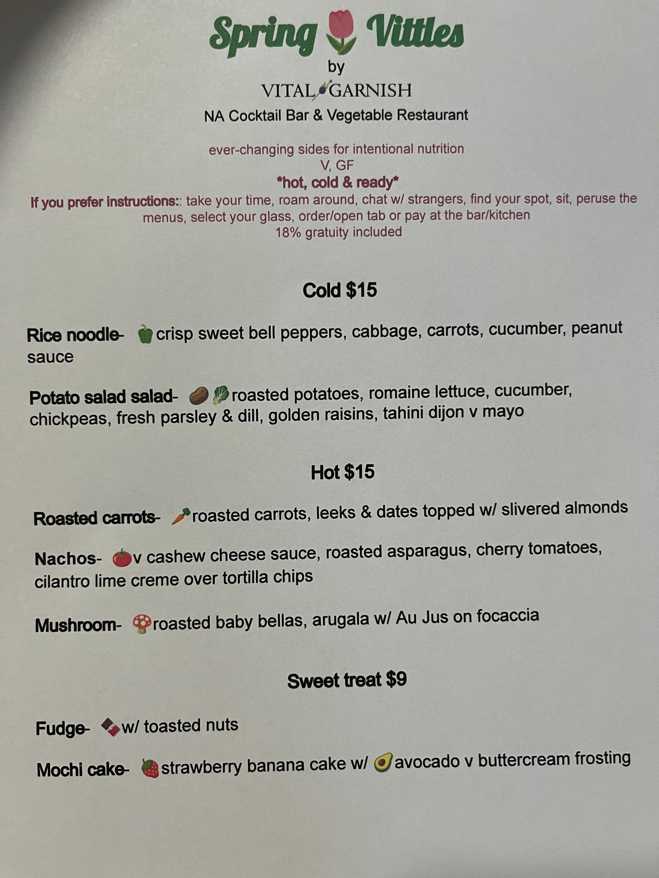 SUNDAYs — Noon - 8pm - open mic & wild card menujust eat, drink, and be merrya surprising little bar to celebrate the gift of LIFE in, w/ scratch made nourishing indulgences & a revival of in-person connectionPop up performances & eventsseasonally changing food & drink menu:•vittles — small plates glorifying seasonal produce in simple delectable fashions